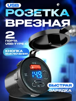 Розетка для авто врезная 1 USB 1 Type-C быстрая зарядка