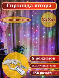 Гирлянда штора с пультом на окно 3х2 м разноцветная