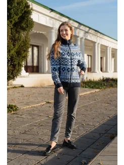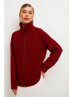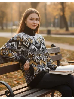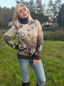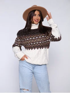 Свитер оверсайз с горлом вязаный теплый с принтом
