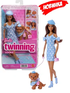 Кукла Барби Твиннинг с собакой в синей одежде в горошек