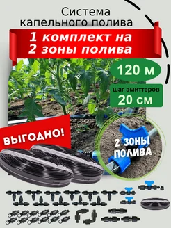 Капельный полив на 2 зоны для огорода на 120 м, шаг 20 см