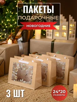 Пакеты подарочные новогодние крафтовые с окном, 24х20, 3 шт