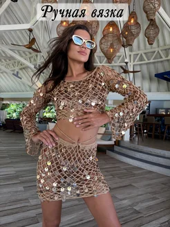 Костюм с юбкой пляжный вязаный с пайетками