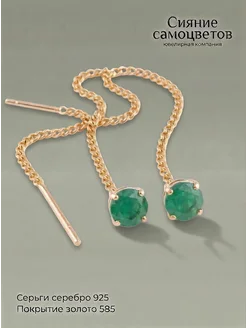 Ювелирные серьги протяжки серебро 925 585 с изумрудом