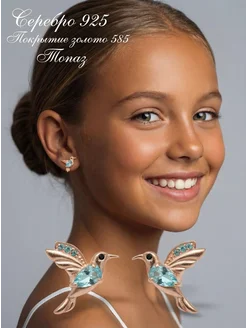 Ювелирные серьги-пусеты колибри серебро 925 топаз детские