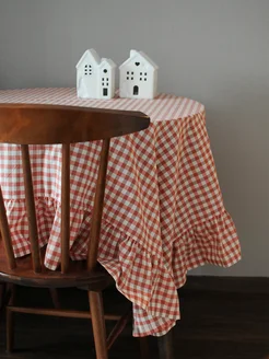 Скатерть из вареного хлопка в бежево-красную клетку с рюшей
