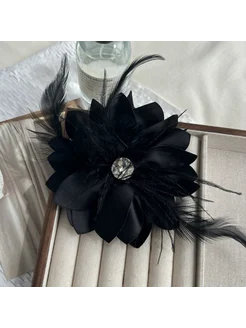 Брошь цветок большая чёрная со стразами и перьями
