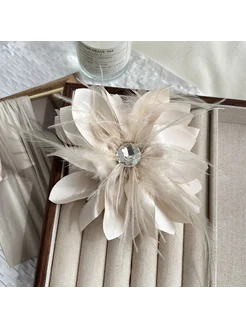 Брошь цветок большая со стразами и перьями