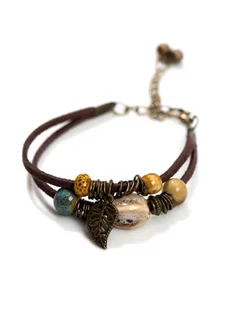 Браслет кожаный в этническом стиле "Листок с камнем"