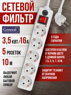 Сетевой фильтр, 5 розеток, 10 метров, белый