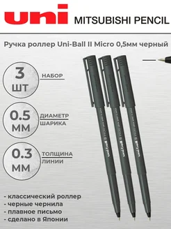 Ручка роллер Uni-Ball II Micro 0,5 мм 3 шт черный