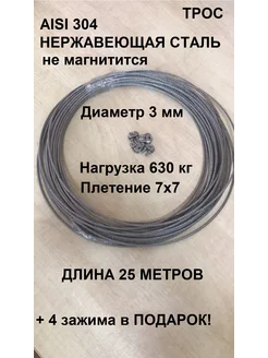 Трос из нержавеющей стали AISI 304 3 мм 25 метров + 4 зажима