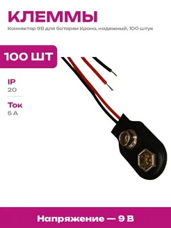 Надежная клемма на крону 9В, облуженный провод 15см, 100 шт