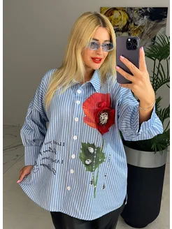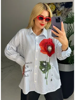 Рубашка оверсайз в полоску офисная со стразами
