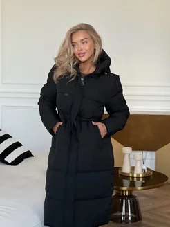 Пуховик женский зимний с поясом и капюшоном пальто