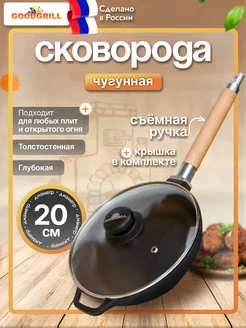 Сковорода чугунная 20 см с крышкой со съемной ручкой