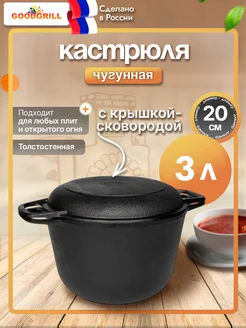 Кастрюля чугунная литая 3л с крышкой-сковородой