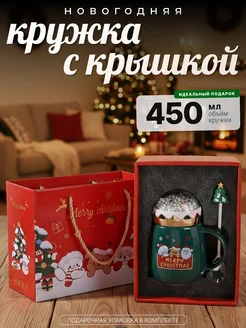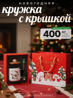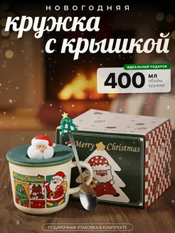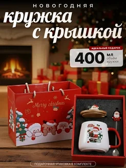 Кружка новогодняя с ложкой и крышкой подарочная