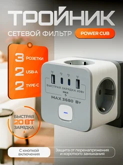 Тройник быстрая зарядка Type-C USB сетевой фильтр