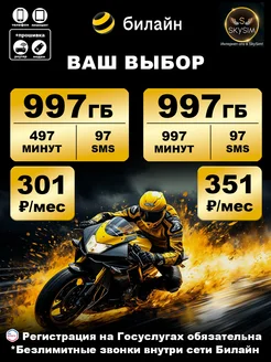 Сим карта Билайн 997Гб+ 301р мес для смартфона