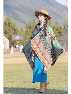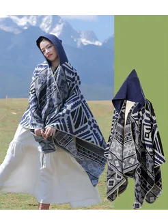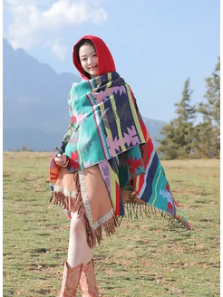 Пончо бохо с капюшоном кашемировое