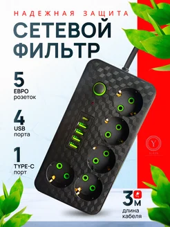Сетевой фильтр 5 розеток 4 usb + 1 type c 3 м