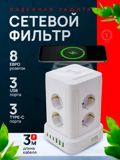 Сетевой фильтр с беспроводной зарядкой 8 розеток+3 usb+3type