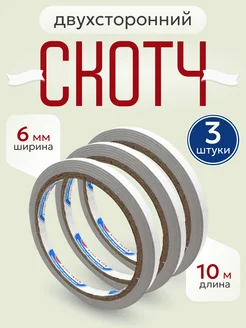 Скотч двусторонний прозрачный, узкий 6 мм*10 м, 3 штуки