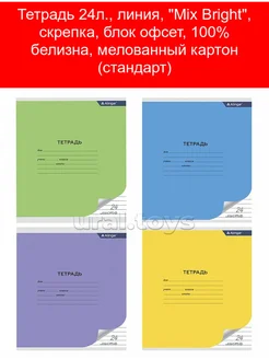 Тетрадь 24л, линия, "Mix Bright", скрепка, блок офсет, 100%