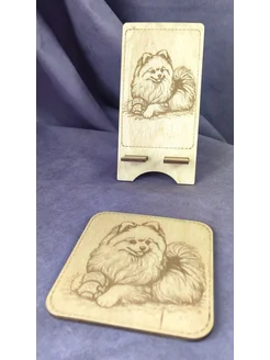 Подставки деревянные для телефона и кружки с Шпицем