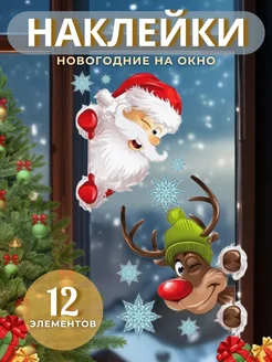 Новогодние наклейки на окна Дед Мороз и олень Новый год