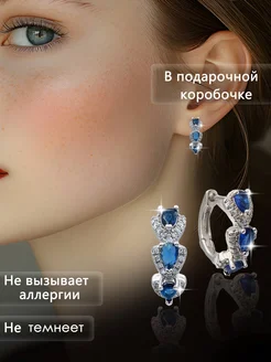 серебристые серьги колечки с синим цирконом