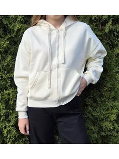 Зип худи толстовка с начесом и капюшоном однотонная молочная