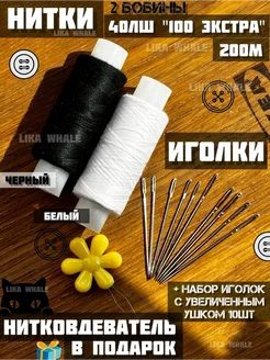 нитки швейные набор 2 шт черные и белые с иголками