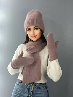 Шапка вязаная с шарфом и варежками из ангоры с пухом норки