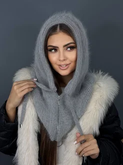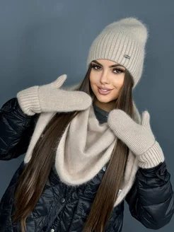 Шапка вязаная с баф и варежками из ангоры с пухом норки