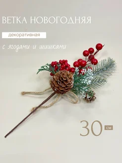 Ветка новогодняя c ягодами и шишками 30см для декора