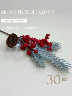 Ветка новогодняя c ягодами и шишкой 30см для декора