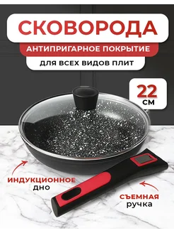 Сковородка антипригарная со съемной ручкой и крышкой, 22 см