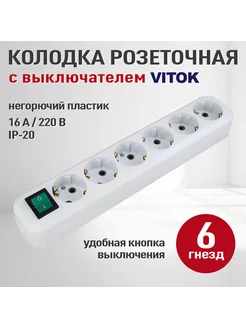 Колодка для удлинителя 6 гнезд с заземлением и выключателем