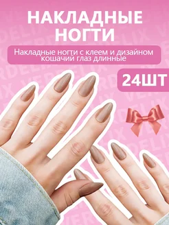 Накладные ногти с клеем и дизайном кошачий глаз длинные