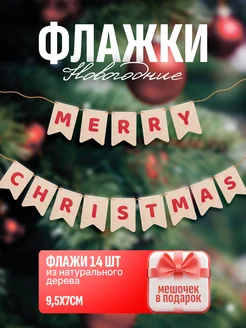 Флажки деревянные Новый Год и Рождество, набор 14 шт