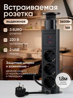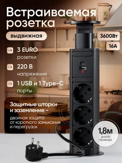Встраиваемая выдвижная розетка для столешницы c USB и type-C
