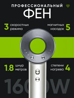 Фен для волос мощный с насадками 5 в 1 профессиональный 1.8м
