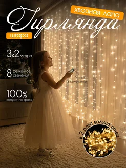 гирлянда штора хвойная лапа на окно 3x2 теплый свет