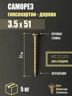 Саморез гипсокартон дерево 3.5х51, желтый цинк, 5 кг
