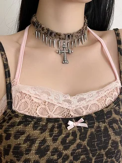 Чокер Y2K леопардовая подвеска с крестом и шипами гранж