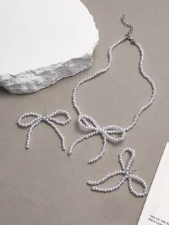 Набор 2 предмета серьги, колье «Жемчуг» бантик, белый в сер