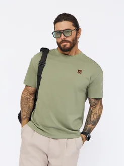 Брендовая зелёная широкая футболка оверсайз хлопок