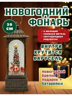 Новогодний фонарь со снегом 30см внутри крутящаяся карусель